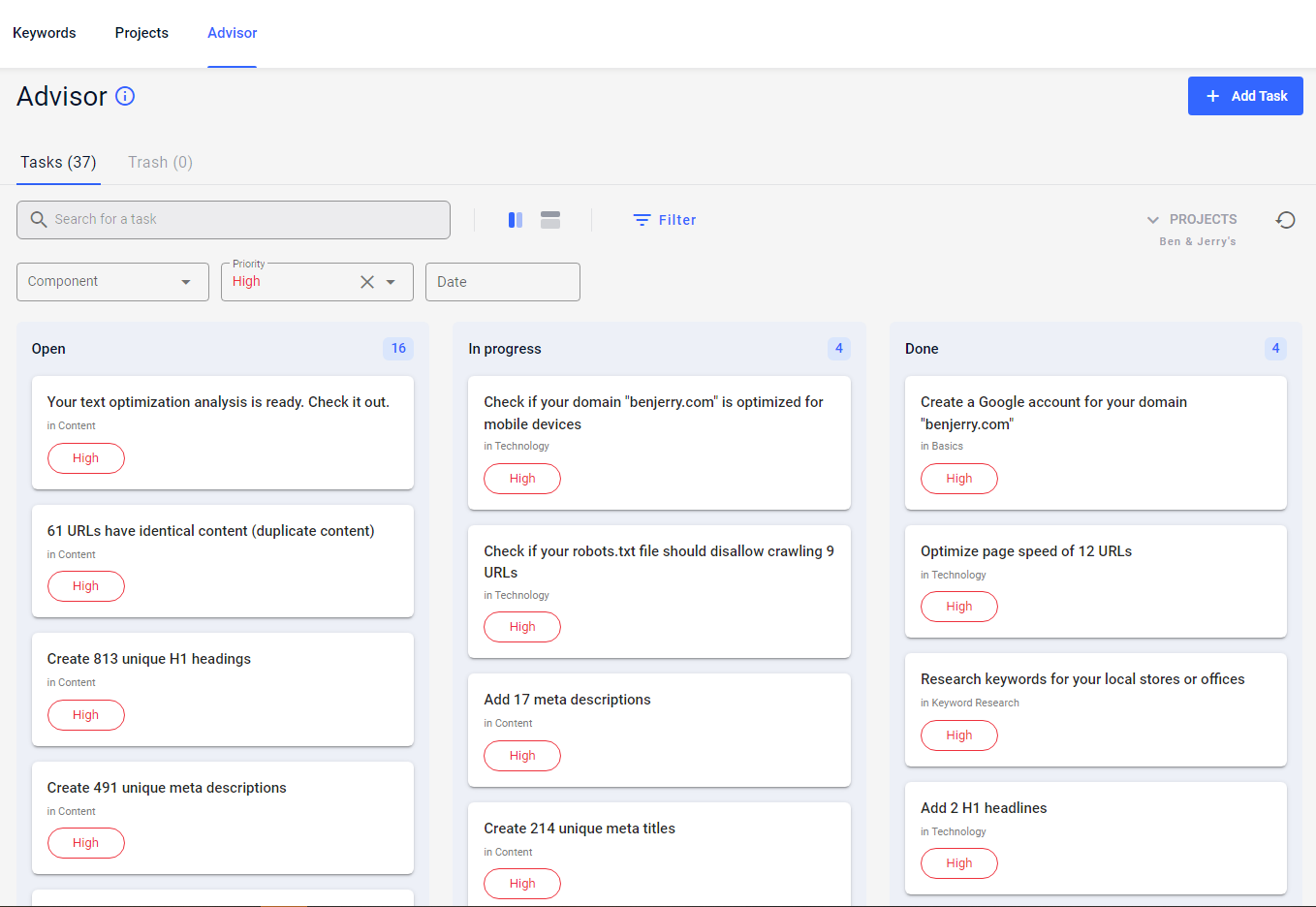 Keep in mind that you do need a Project for the Advisor feature to work. Also, most of the Advisor's tasks are tailored to a Project's website (usually yours or your client's). If you manage more than one website, you'll need to create an extra Project for each of them.